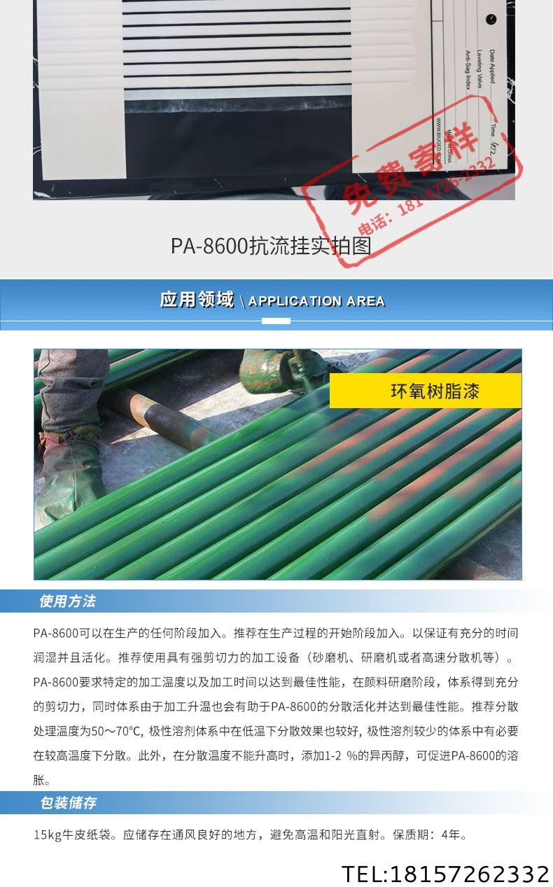 PA-8600廣泛應用于各類合成樹脂涂料,特別是環氧涂料,氯化橡膠涂料和醇酸、聚氨酯等重防腐涂料,配合極性溶劑使用效果更佳。