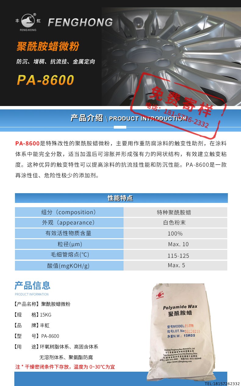 PA-8600是特殊改性的聚酰胺蠟微粉,主要用作重防腐涂料的觸變性助劑,在涂料體系中能完全分散,適當加溫后可溶脹并形成強有力的網狀結構,有效建立觸變粘度。這種優異的觸變特性可以提高涂料的抗流掛性能和防沉性能。PA-8600是一款再涂性佳、危險性極少的添加劑。